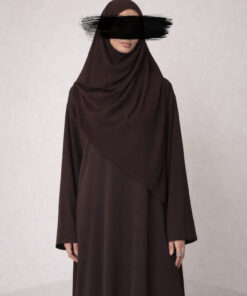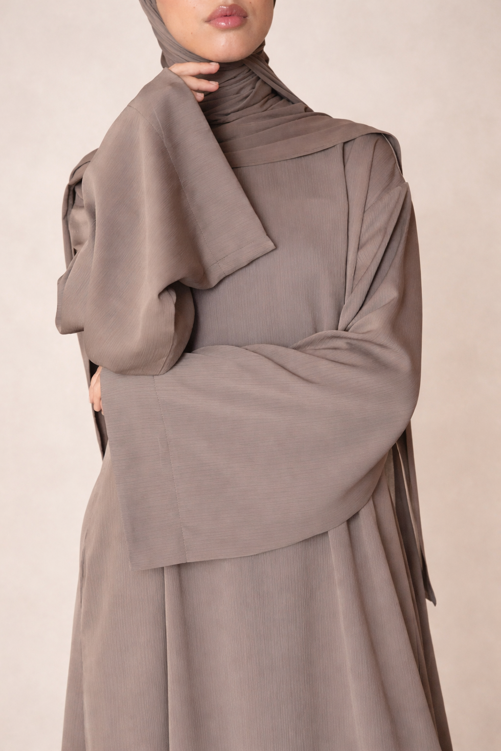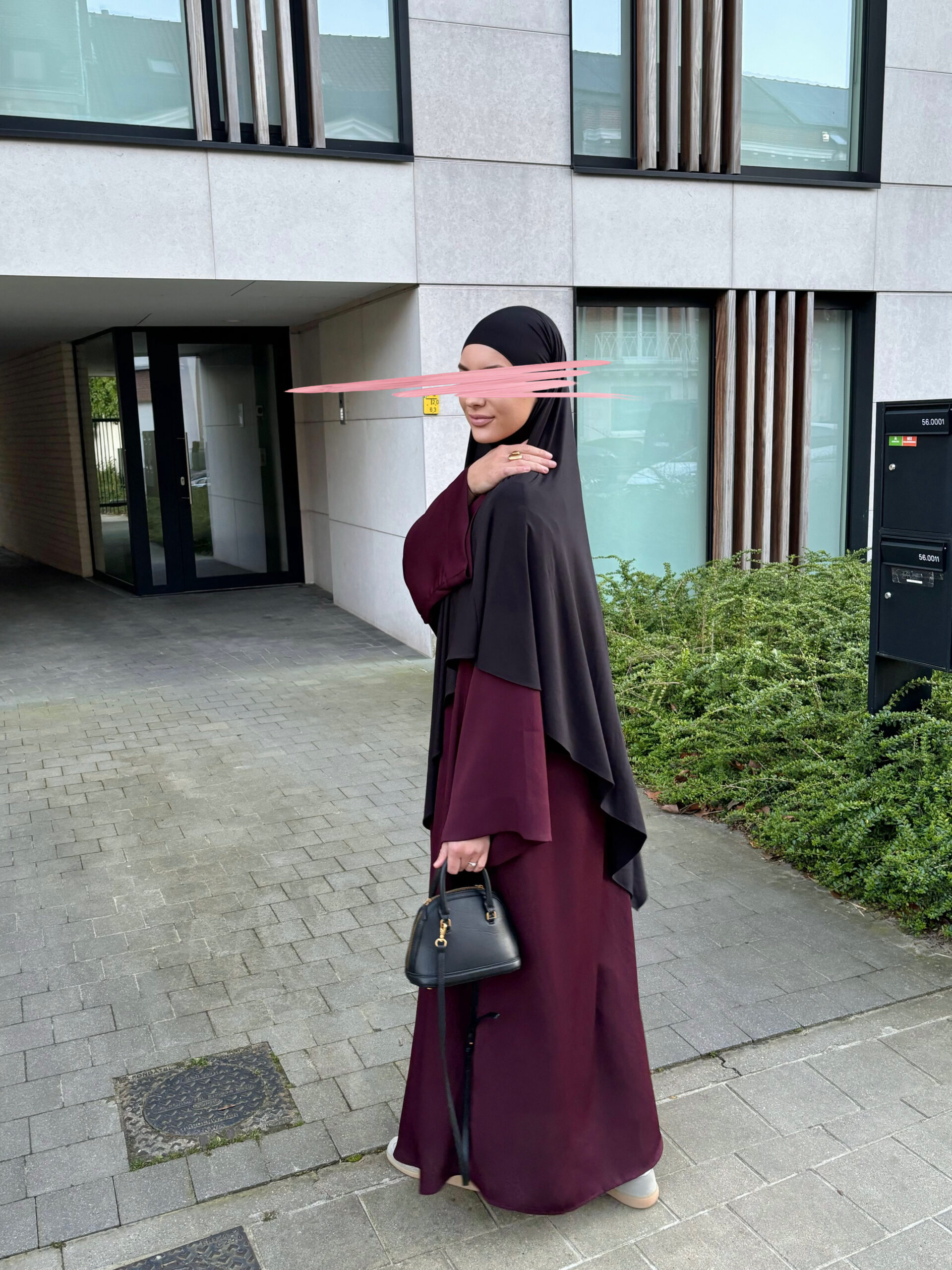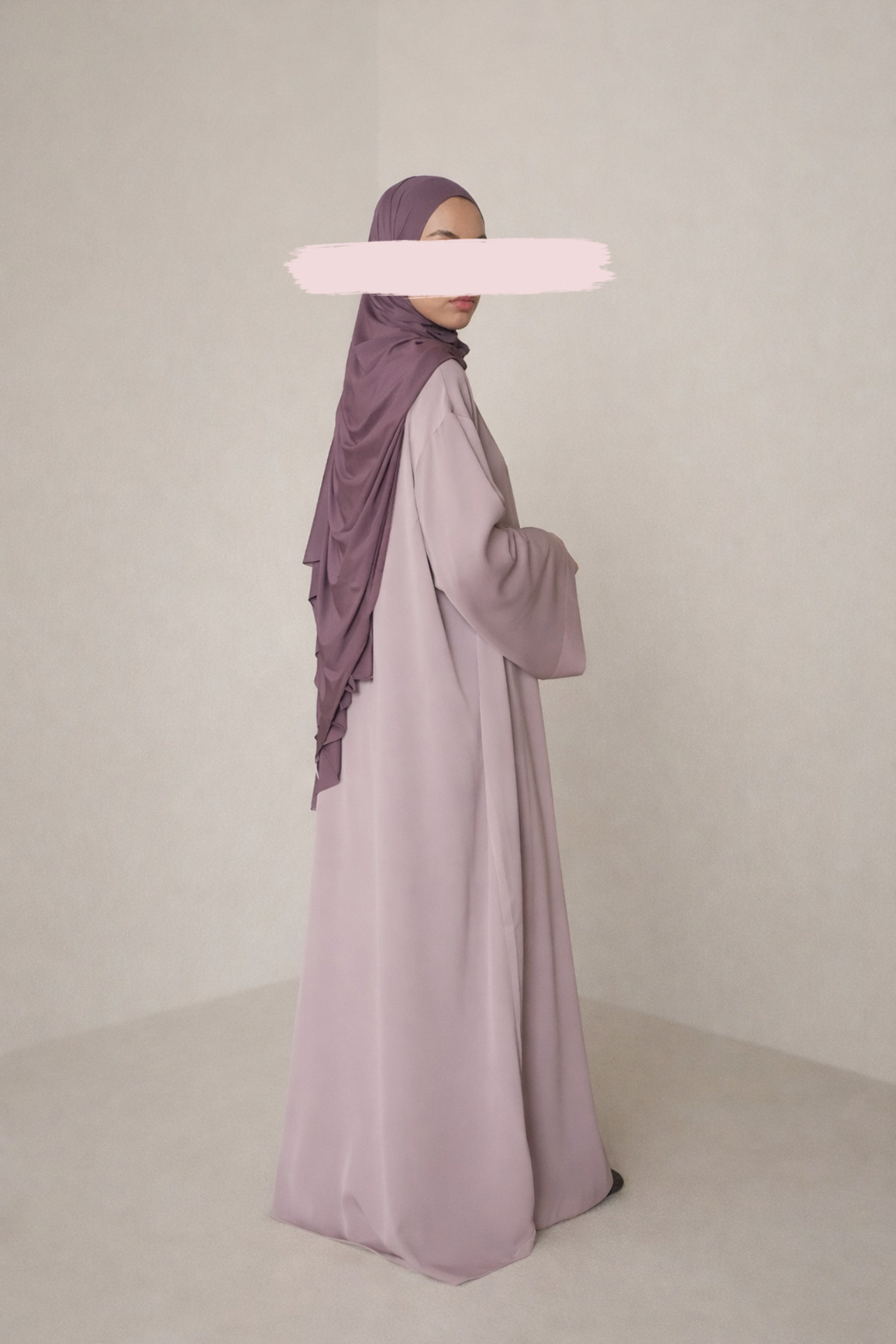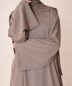 Abaya longue avec une coupe évasée et couvrante. Son tissu légèrement plissé et subtilement satiné lui donne un rendu très chic et élégant.