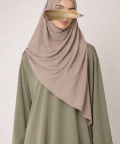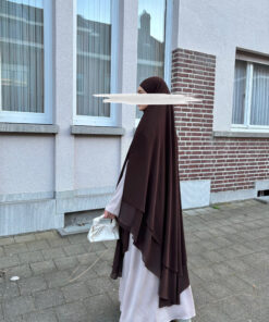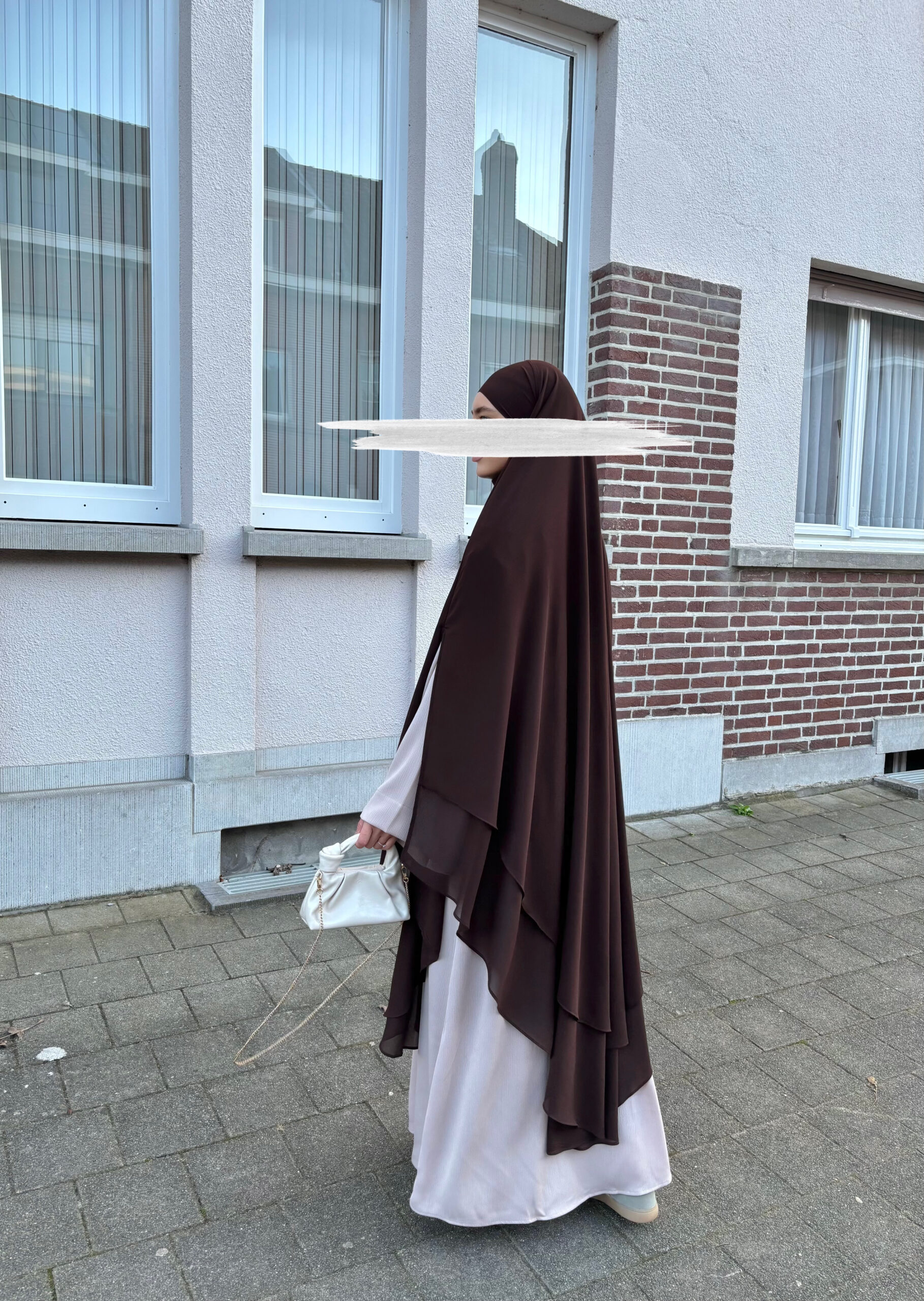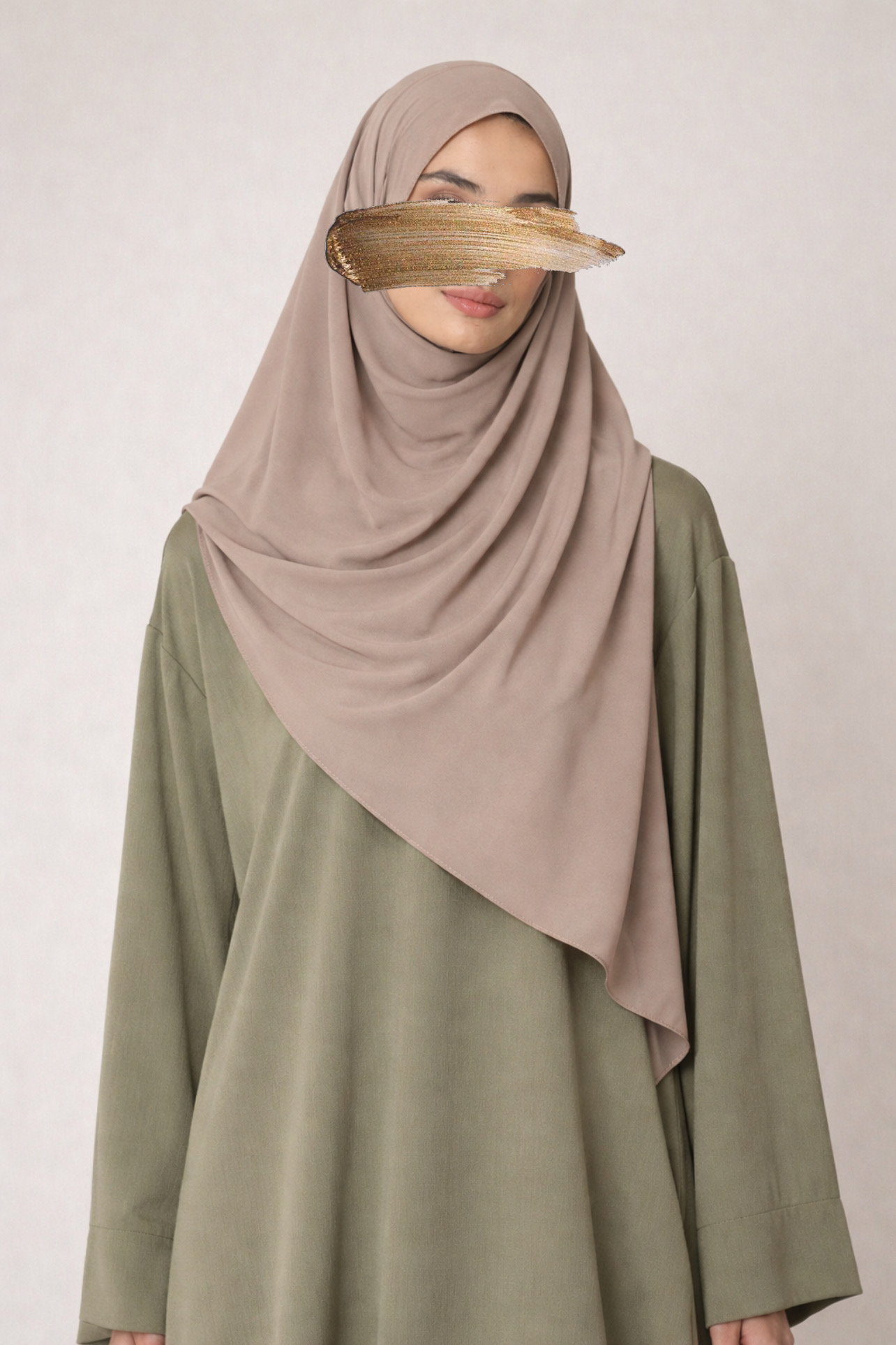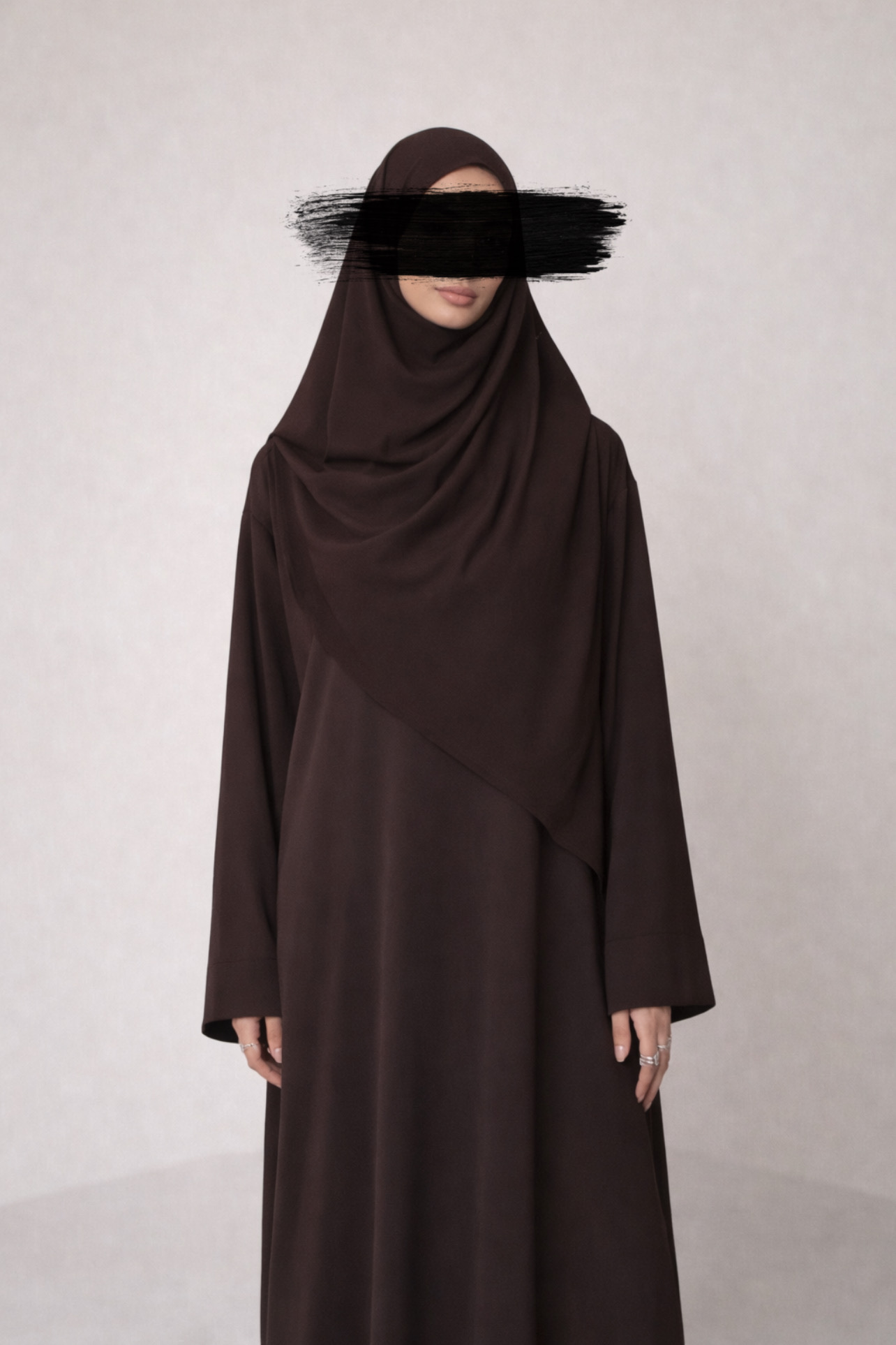 Abaya longue avec une coupe évasée et couvrante. Son tissu légèrement plissé et subtilement satiné lui donne un rendu très chic et élégant.